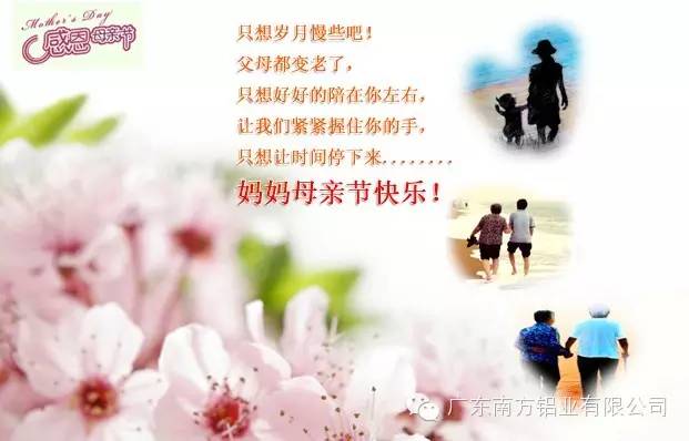 岁月慢些吧!父母们都变老了!让我们紧紧握住他们的手,让时间停下来,让我们多陪陪您,哪怕是:陪您多走一段路,多聊一会,多看几眼,慢慢的慢慢的把无尽的思念和话语一一细诉:母亲辛苦了!愿长寿安康!祝母亲节快乐!